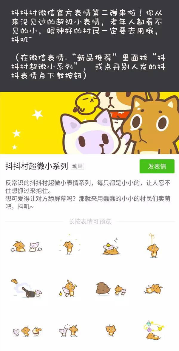 抖抖村的第二弹又上微信官方表情啦! 这次的表情的风格非常嚣张,你一定没见过这么小,这么可爱的表情。村民们一定去用用!希望你们喜欢。